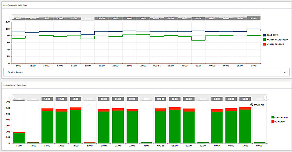 코그넥스 Edge Intelligence(EI)를 결합한 DataMan 280은 쉬운 웹 브라우저 연결, 장치 관리, 성능 모니터링과 같은 고급 Industry 4.0 기능을 제공합니다. 이를 통해 사용자는 한 번에 여러 대의 장치를 구성하고 수분 내에 중요한 시스템 성능 척도의 트렌드를 측정할 수 있습니다. 시설 관리자는 트렌드를 식별하고 성능 저하가 감지될 때 빠르게 조치를 취할 수 있습니다.